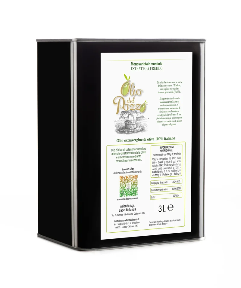 Monocultivar MORAIOLO - 100% ITALIANOOlio extravergine di oliva ottenuto da spremitura a freddo di olive della cultivar MORAIOLO. Le nostre piante, coltivate nel comune di Gualdo Cattaneo, sono situate ad una altitudine di 400 m, non subiscono alcun trattamento chimico e le olive vengono raccolte entro la prima settimana di novembre per ottenere un prodotto che esprime le migliori caratteristiche organolettiche ed una lunga conservazione.Il prodotto viene filtrato al fine di garantire una adeguata stabilità nel tempo.Sulla etichetta è presente un QR CODE che permette di accedere alla sezione dati tecnici (analisi chimiche e certificato di multiresidualità) del nostro